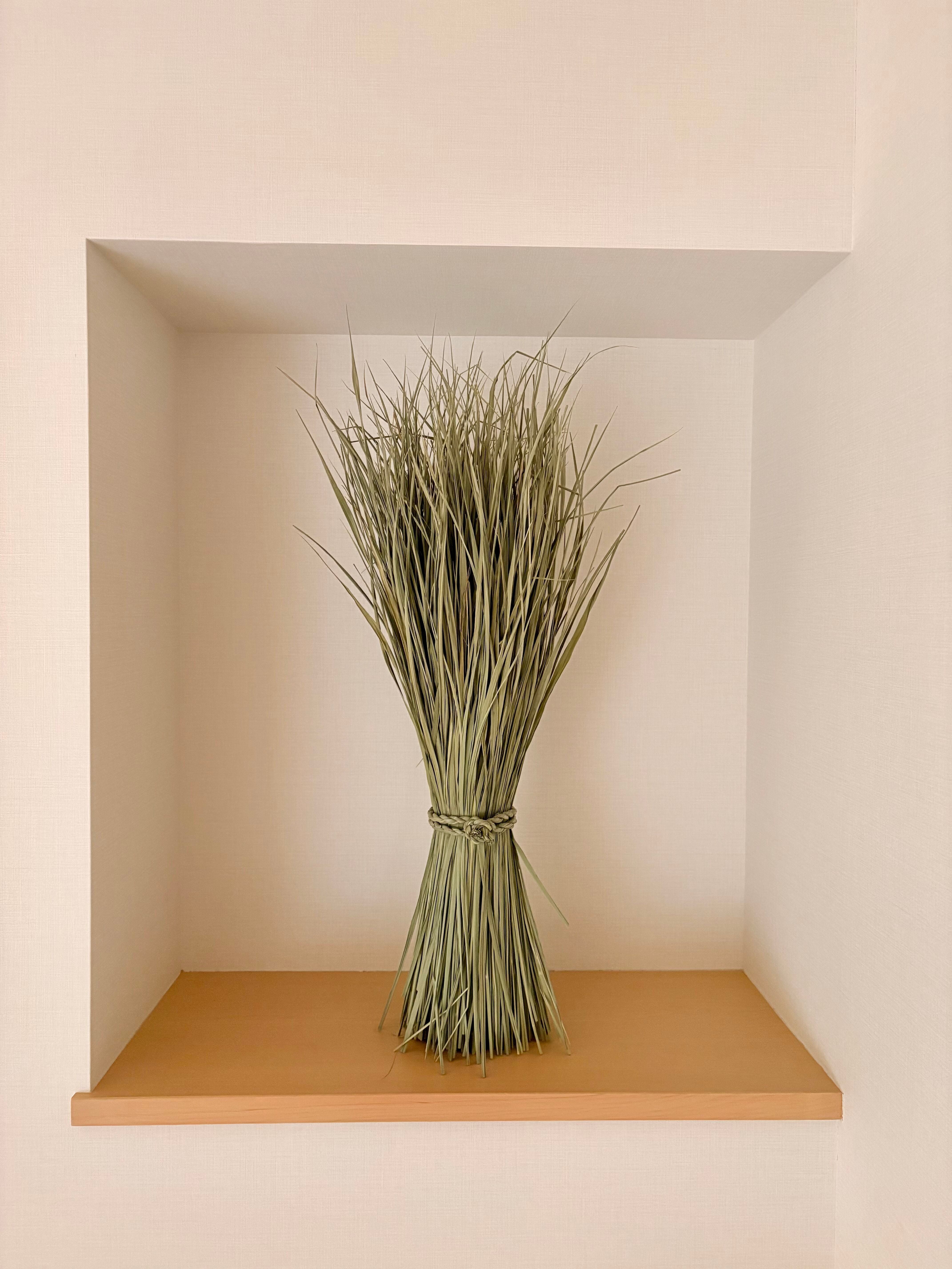 しめ縄づくりで培った技術を応用し、縁起物であるわら細工を通年制作しております。本商品である青わらは主にわら細工の制作に使用している材料です。