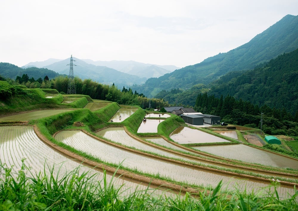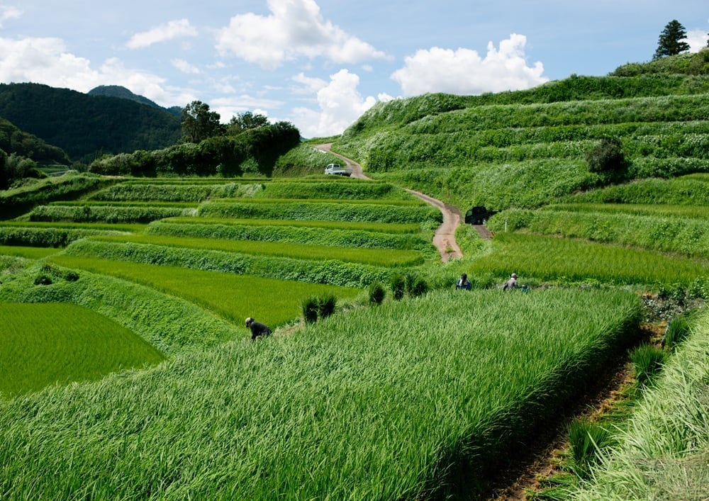 そのような地域で工房は約70年にわたりしめ縄を作り続けてきました。制作の材料となる稲わらは、棚田で自ら稲を栽培しております。